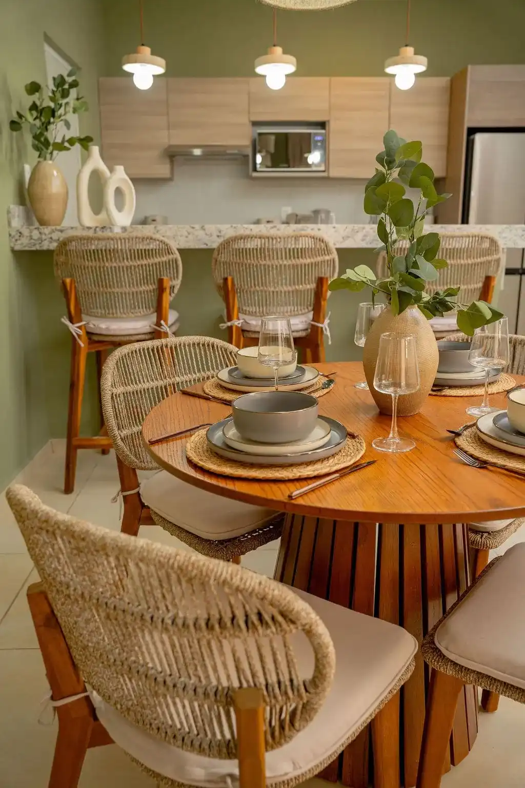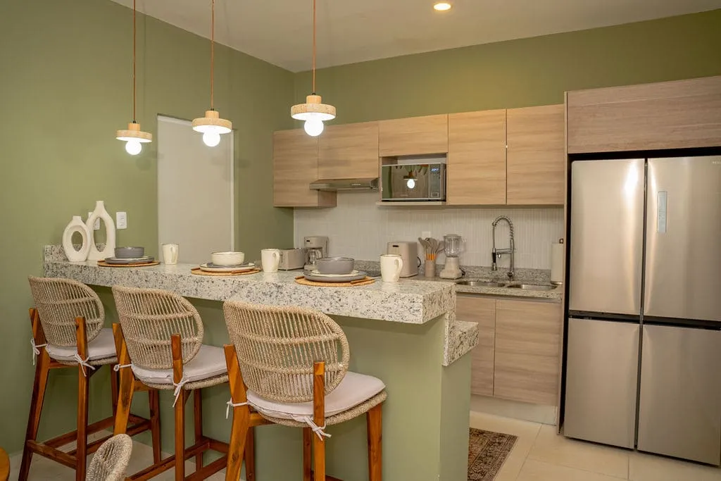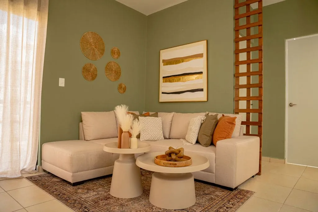 The living area opens onto a balcony that brings in natural light and fresh air. Soft green tones, peach, subtle gold accents, and earthy hues create a warm, contemporary atmosphere. It’s a space that naturally encourages a slower pace—ideal for unwinding after a beach day or enjoying a quiet morning at home.